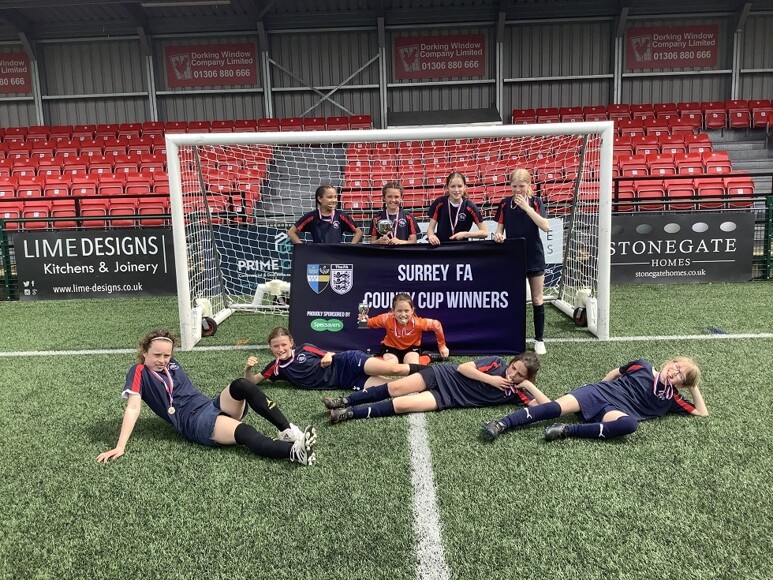The Year 6 Girls’ Football Team played in the Surrey U11 cup final this afternoon and won 1-0! It was a nail-biting game but the girls kept pushing, showing real grit and determination. After many attempts, they finally scored a goal, late into the second half. It was a well-deserved win and the girls showed tremendous sportsmanship throughout. They came back to school victorious, with a new addition for our trophy cabinet! Congratulations to the team and a big thank you to Fontana Soccer for running their training sessions throughout the year and to all the parents who have supported them throughout all their matches.